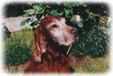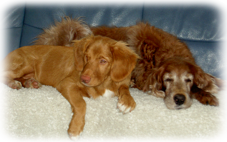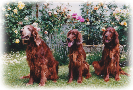 Die letzten Setter, links Roy, rechts Wega. Und in der Mitte ihre gemeinsame Tochter Xantha, die uns noch bis 2009 geblieben ist. Nachdem es ihr 2008 schon nicht mehr so gut ging, hat ihr der junge Toller Barcley noch einmal richtig Auftrieb gegeben.